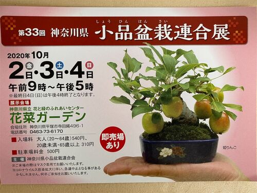 告知が遅くて申し訳ありません。 神奈川県平塚市の花菜ガーデンで開催される、「神奈川県小品盆栽連合展」が開催されます。 神奈川県の小品盆栽の愛好会が合同で開催する展示会です。 第33回 神奈川県小品盆栽連合展10月2日(金)〜4日(日) 9時〜17時(最終日は…